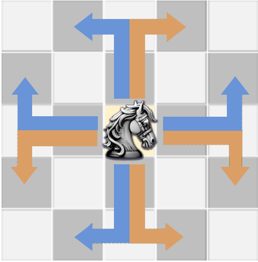 2.) Each of the Knight’s moves is conducted in the same manner as a regular knight’s move on a chess board. The Knight can move up or down 2 spaces and then right or left 1 space or move left or right 2 spaces and then up or down 1 space. The combination of the 3 spaces is conducted in a single Knight’s move.